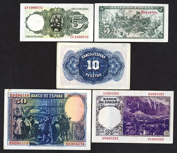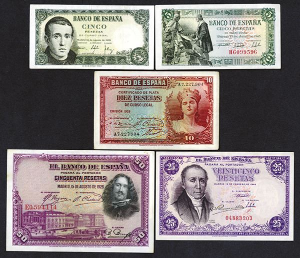 Spain. 5, 10, 25, 50 Pesetas. P-75a; 86a; 129; 130; 139. Great vignettes of historic people and events. Choice Extremely Fine with the appearance of better. One or two with paper tone. 5 pieces.