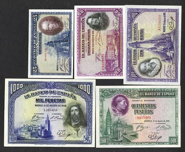 Spain. 25, 50, 100, 500, 1000 Pesetas. P- 74c; 75c; 76a; 77a; 78a. Wonderful designs in very nice condition. All Choice Extremely Fine. 5 pieces.