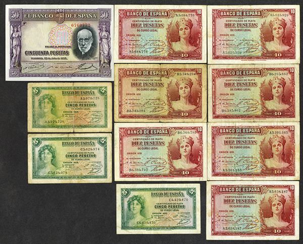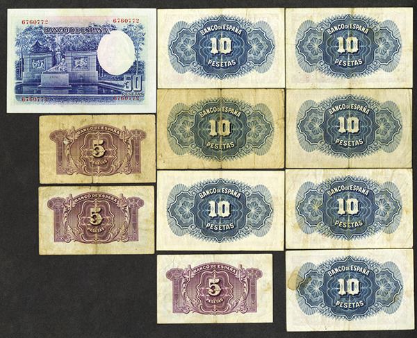 Spain. 5, 10, 50 Pesetas. P-85a (3); 86a(7); 88. First two are Good to Very Good, last is Very Fine. 11 pieces.