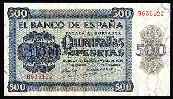 Spain. 500 Pesetas, P-102s. Bridge and Salamanca Cathedral at center back. Perforated. Extremely Fine or better, bold watermark.
