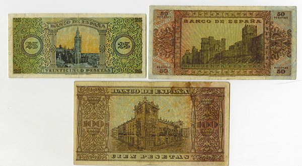Spain. Lot includes issued 1 Peseta, 1938, P-107a, XF; 1 Peseta, 1938, P-108a, UNC; 2 Pesetas, 1938, P-109a, XF; 5 Pesetas, 1938, P-110a, VF; 25 Pesetas, 1938, P-111, VF; 50 Pesetas, 1938, P-112, VF w/one hole; and 100 Pesetas, 1938, P-113, Fine.