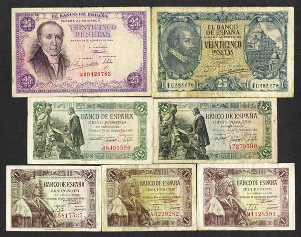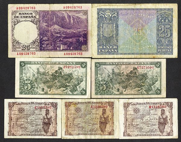 Spain. 1, 5, 25 Pesetas. P-116; 128a (3); 129 (2); 130. Mostly Very Good to Fine. 7 pieces.