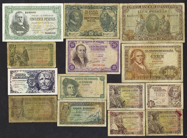 Spain. 1, 5, 25, 50, 100 Pesetas. P-116; 117; 118a; 123a; 126a (2);127a; 128a; 129a; 130a; 134a; 135a; 136a; 137a. Mostly Very Good or so, one or two better one with paper tear at fold. 13 pieces