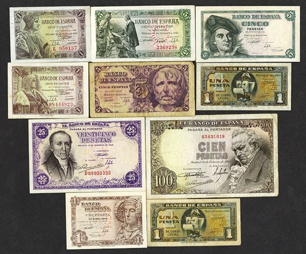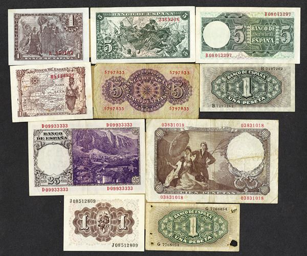 Spain. 1, 5, 25, 100 Pesetas. P-122a (2, one with some mounting remnants on back); 126a; 128a; 129a; 130a; 131a; 134a; 135a; 136a. Some Fine to Very Fine, a few better. 10 pieces.