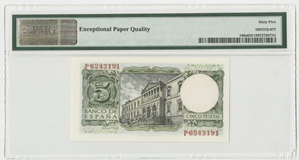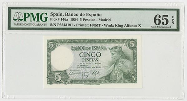 Spain. Issued 5 Pesetas, 1954, P-146a. PMG graded Gem Unc 65 EPQ. FNMT.