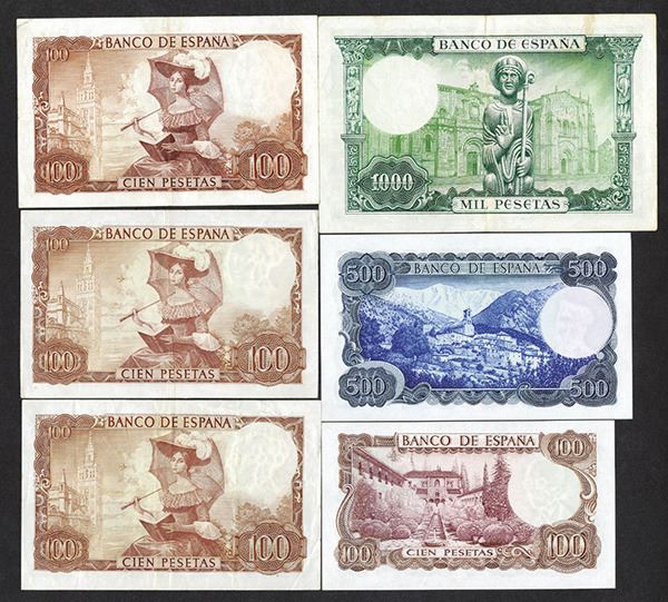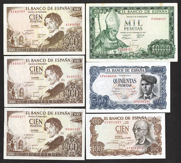 Spain. 100, 500, 1000 Pesetas. P-150 (3); 151; 152a; 153a. First four are VF, last two are Choice Uncirculated. 6 pieces.