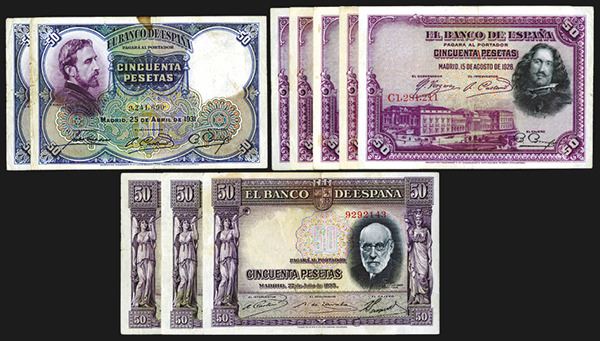 Spain. 50 Pesos. Includes SCWPM 75 (6); 82 (2); 88 (3). Generally Very Good to Fine. 11 pieces.