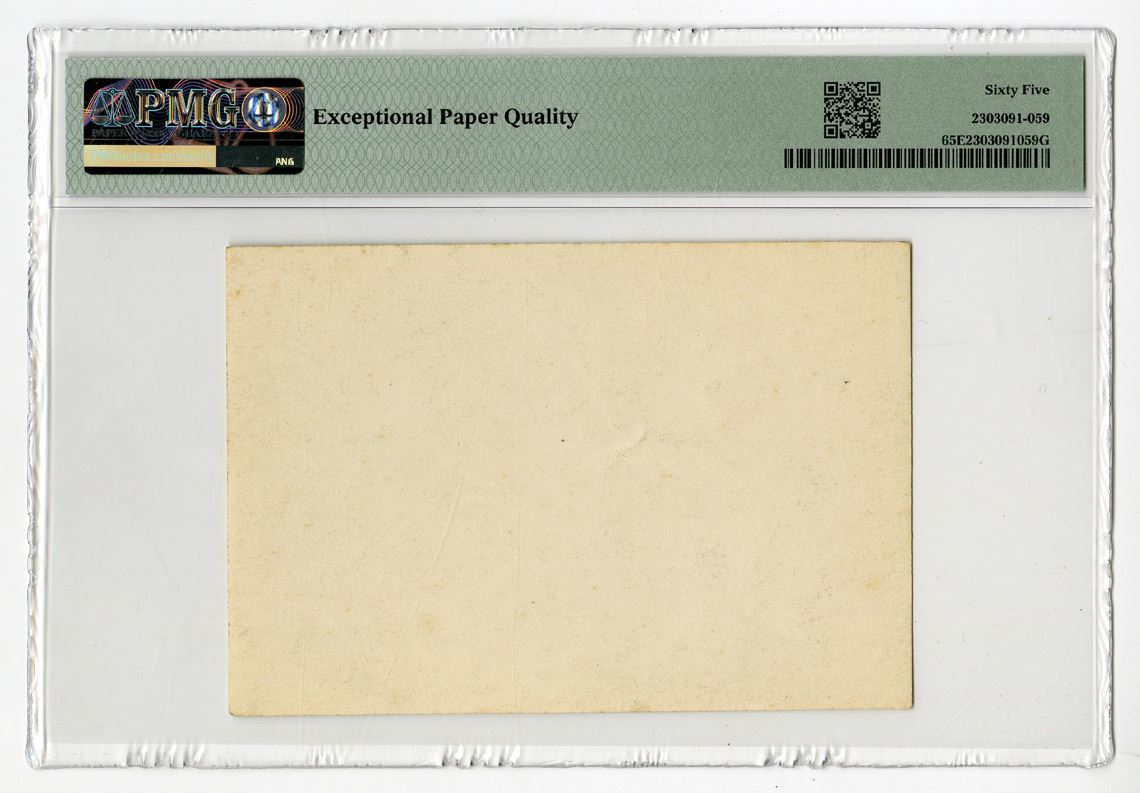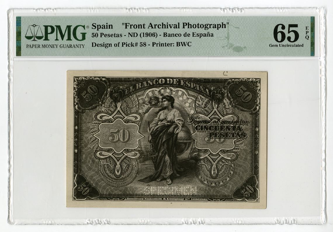 Spain, ND (1906). 50 Pesetas Front Archival Photograph of Design used on P-58, Black and white print with allegorical woman at center, Specimen printed at right, PMG graded Gem Uncirculated 65 EPQ. This photo proof of the original specimen note was used during the production process to determine if the design and text were correct and also used for approvals and the printing company's records. This was from the Bradbury, Wilkinson & Co. Ltd. production and design department.
