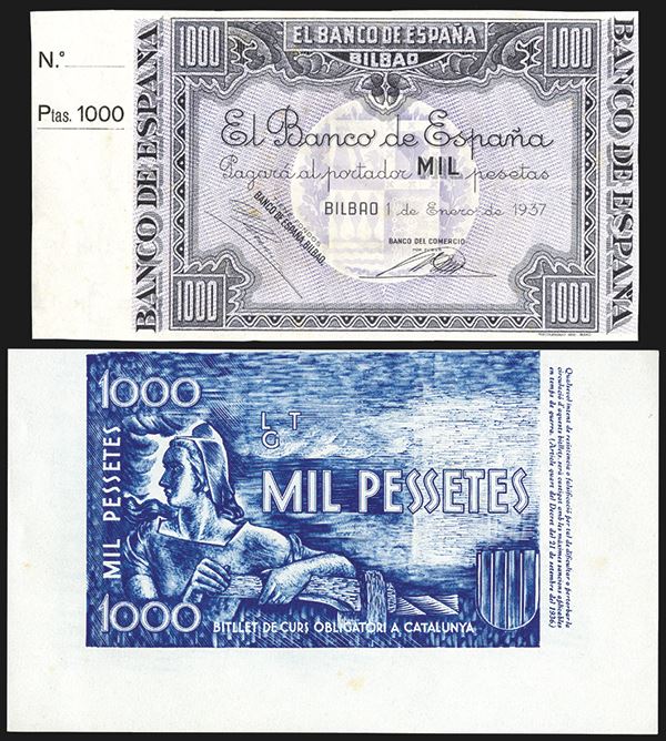 Spain, pair of local notes. The first is a Banco de Espana (Bilbao) 1000 Pesetas, 1937, P-S567, black and lilac obverse, gray blue and brown reverse, featuring industrial workers, measuring 205mm x 112mm, with counterfoil. The second is a Catalunyan 1000 Pesetas, circa late 1930s, blue, featuring woman facing left, on uniface paper measuring 220mm x 130mm. Both UNC, possibly unissued or proof.