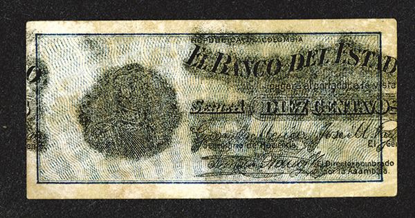 Colombia. 10 Centavos. P-S501 for type. Unlisted in this form. Face printing of overprint text and portrait is off center. Without serial #. Back is printed correctly. Unusual. Choice Very Fine.