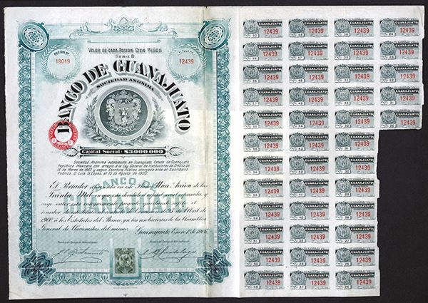 Guanajuato, Mexico. "Winston Churchill" bond, green, one share, arched title over crest in circle, VF, very lightly soiled at right. "Speculative" issue.