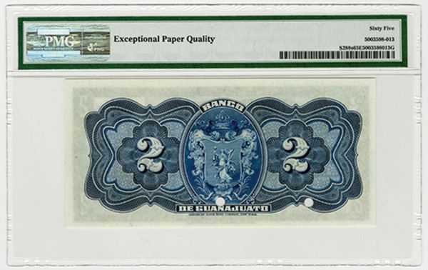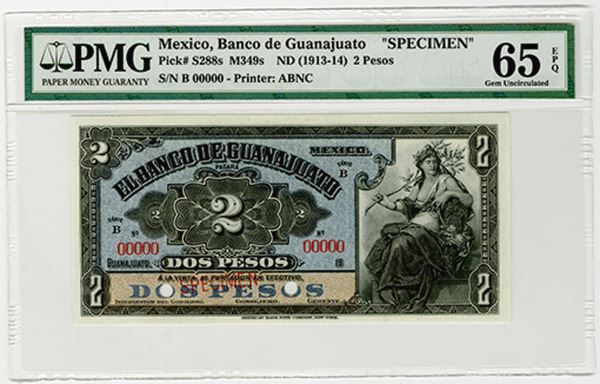 Mexico. Specimen 2 Pesos, ND (1913-1914), P-S288s M349s. PMG graded Gem Unc 65 EPQ (Cert # 5003598-013). ABNC.
