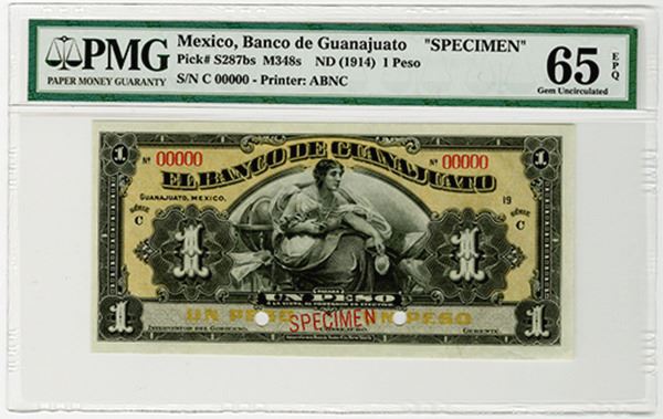 Mexico. Specimen 1 Peso, ND (1914), P-S287bs M348s. PMG graded Gem Unc 65 EPQ (Cert # 5003598-012). ABNC.