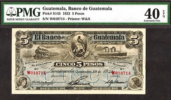 Guatemala, 30th September, 1922, 5 Pesos, P-S145, Issued banknote, Black on light blue underprint, Locomotive on left, Guatemala Arms in middle and Steamship at right, PMG graded Extremely Fine 40 EPQ but appears uncirculated with large even margins and bright colors. Very attractive for grade and only one note graded higher in the PMG census, W&S.