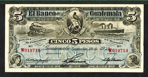 Guatemala, 30th September, 1922, 5 Pesos, P-S145, Issued banknote, Black on light blue underprint, Locomotive on left, Guatemala Arms in middle and Steamship at right, PMG graded Extremely Fine 40 EPQ but appears uncirculated with large even margins and bright colors. Very attractive for grade and only one note graded higher in the PMG census, W&S.