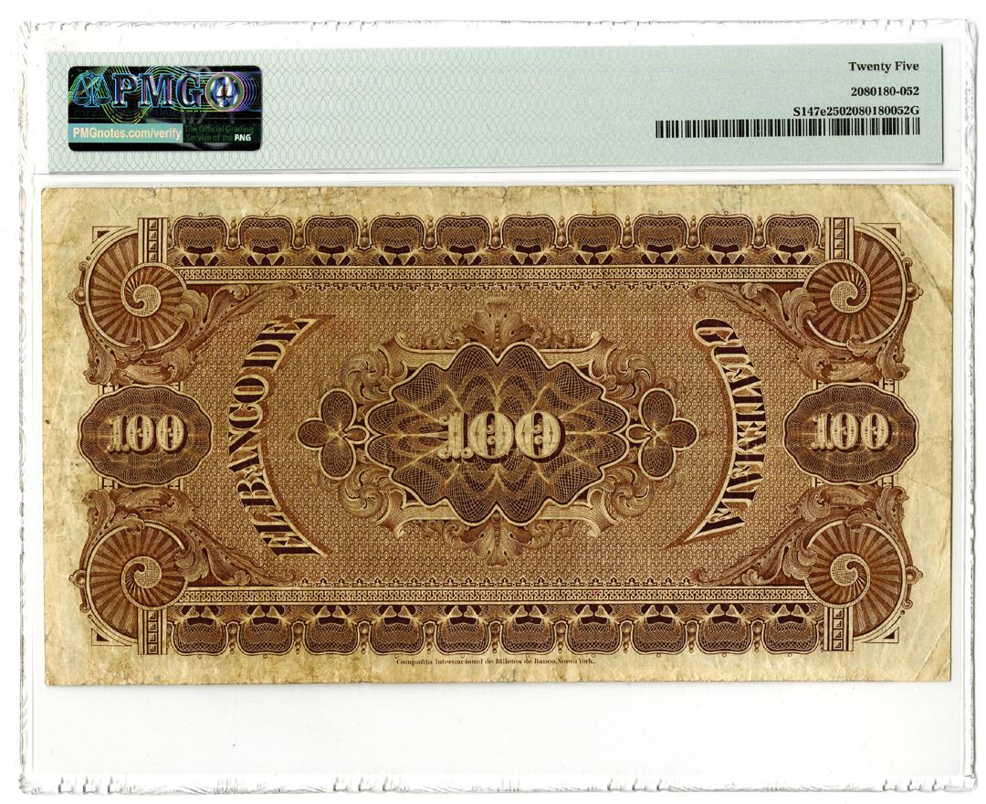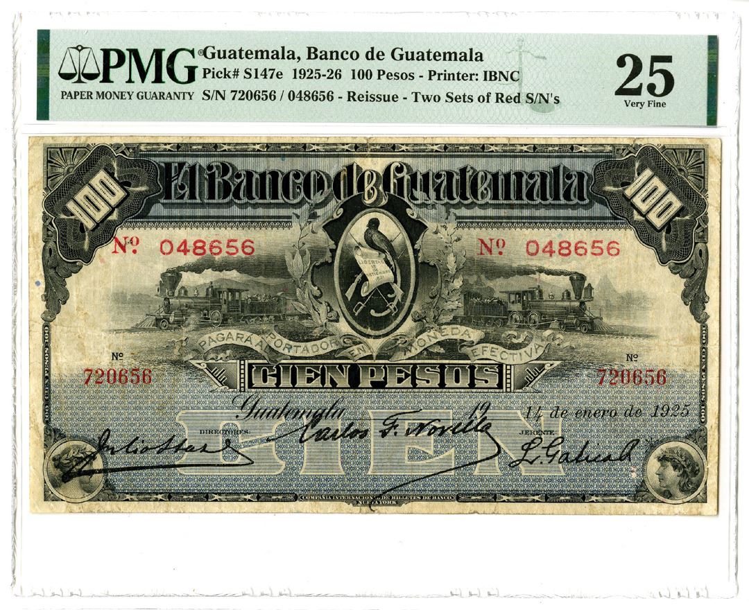 Guatemala, 1925-26. Banco de Guatemala Caja Reguladora Reissue 100 Pesos, P-S147e, Issued Banknote. Black on blue underprint with trains coming from behind arms at center. Two sets of S/ns 720656 & 048656. PMG graded Very Fine 25. Only one note out of 8 graded in the PMG census grades higher. This will be almost impossible to improve upon. Rare note even in lower grades.