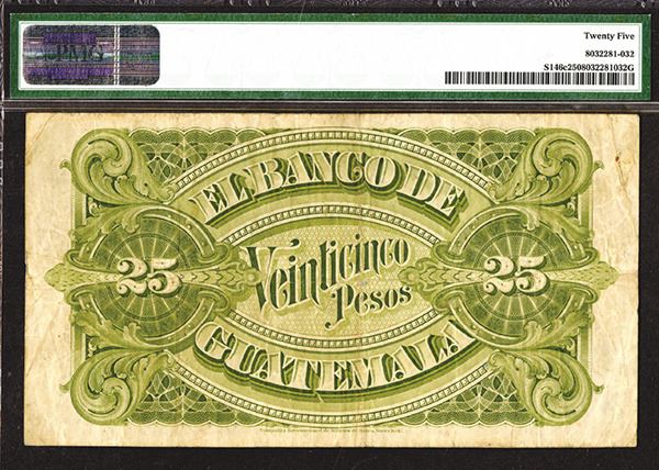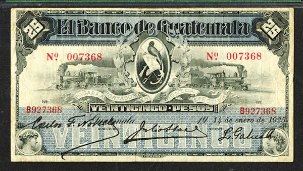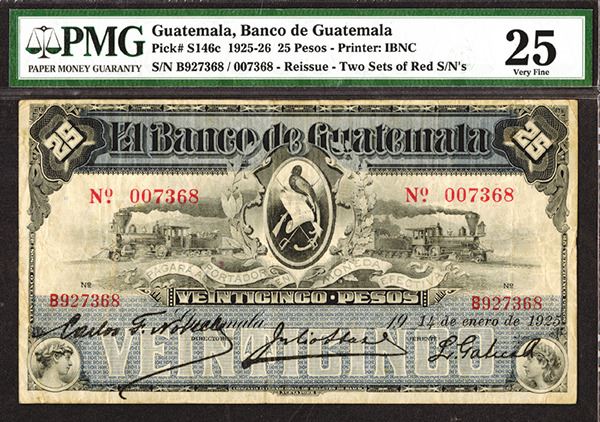 Guatemala, 1925, 25 Pesos, P-S146c, Issued banknote, Black on light blue underprint, Locomotives on left and right, Guatemala Arms in middle, 2 sets of serial numbers, Original S/N B927368, Reissue # 007368, PMG graded Very Fine 25 with large even margins and bright colors. Very attractive for grade and the finest of 2 graded in the PMG census and first time seen by cataloger, W&S.
