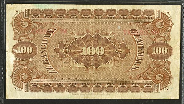 Guatemala, 1925, 100 Pesos, P-S147e, Issued banknote, Black on light blue underprint, Locomotives on left and right, Guatemala Arms in middle, 2 sets of serial numbers, Original S/N774397, Reissue S/N 102397, PMG graded Very Fine 30 with large even margins and bright colors. Very attractive for grade and the finest of 2 graded in the PMG census, IBNC.