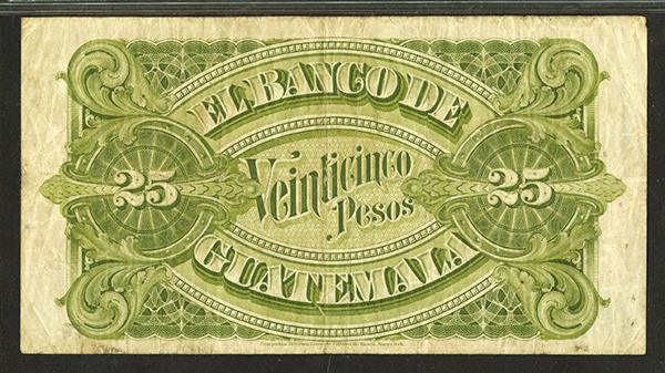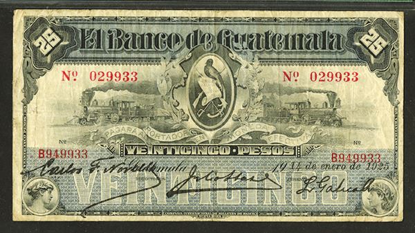 Guatemala, 1925, 25 Pesos, P-S146c, Issued banknote, Black on light blue under print, Locomotives on left and right, Guatemala Arms in middle, 2 sets of serial numbers, Original S/N B949933, Reissue #029933, PMG graded Very Fine 25 with large even margins and bright colors. Very attractive for grade and the tied for the finest of 2 graded in the PMG census, W&S.