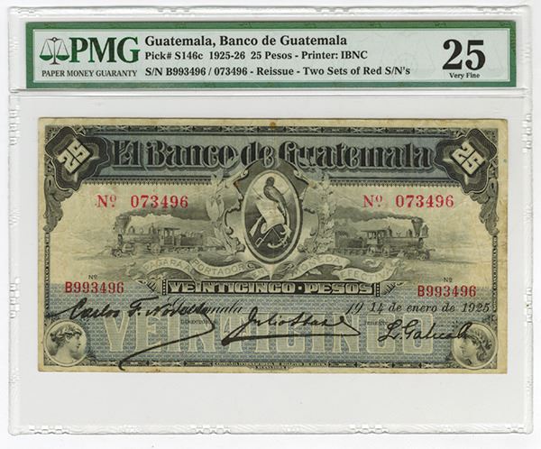 Guatemala, 1925, 25 Pesos, P-S146c, Issued banknote, Black on light blue underprint, Locomotives on left and right, Guatemala Arms in middle, 2 sets of serial numbers, Original S/N B993496, Reissue # 0073496, PMG graded Very Fine 25 with large even margins and bright colors. Very attractive for grade and the finest of 2 graded in the PMG census and first time seen by cataloger, W&S.