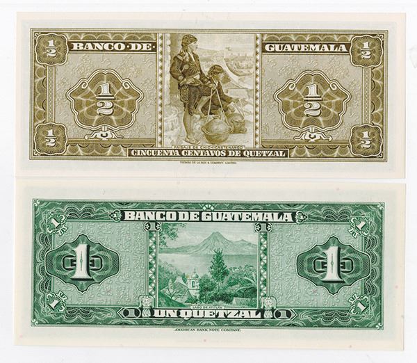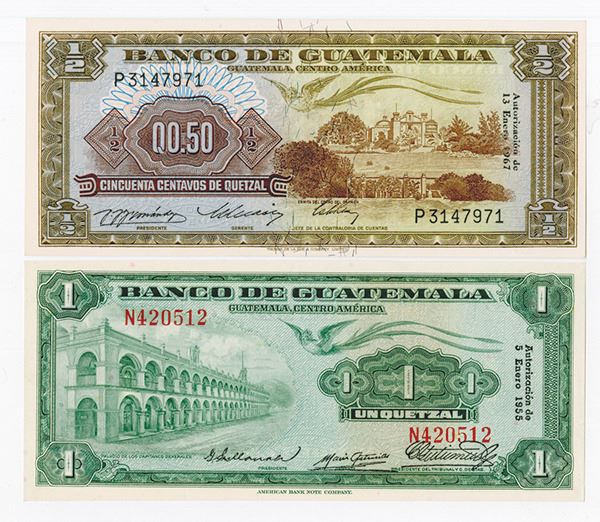 Guatemala. Includes 1/2 Quetzal, 1967, P-51d, Choice About Uncirculated, TDLR; and 1 Quetzal, 1955, P-30, Choice About Uncirculated, ABNC.
