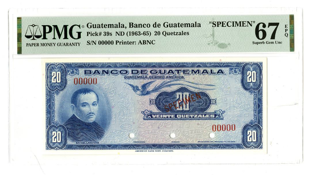 Guatemala, ND (1963-65). 20 Quetzales, P-39s, Specimen banknote, Blue on light blue and purple underprint, Portrait of Rafael Landivar at left, back blue, Specimen overprint and S/N 00000, POCs, PMG graded Superb Gem Uncirculated 67 EPQ. Printer: ABNC. Tied with 1 other note as highest graded out of 9 in the PMG census.