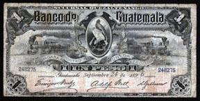 1896. 1 Peso, P-S149 issued banknote, black on light red-orange, Arms of Guatemala flanked by locomotives, back red-orange. VG condition. Rare note in any form or condition. ABNC.