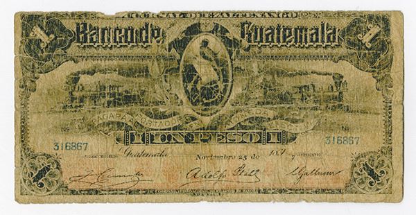 Guatemala. 1 Peso, 1897, P-S141a, S/N 316867, Very Good with lots of wear, IBNC.