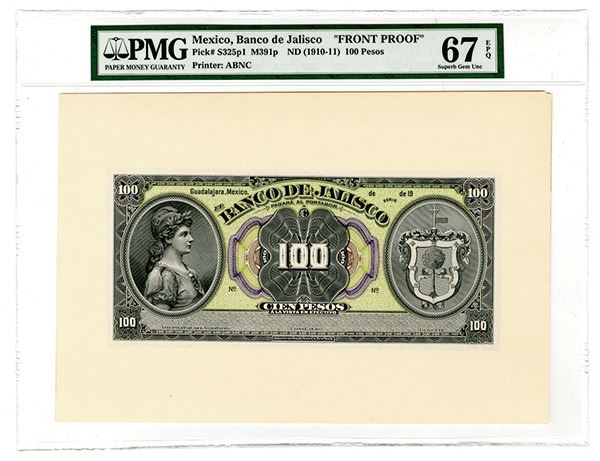 Guadalajara, Mexico. 19xx (ca. 1910-1911), 100 Pesos, NS. P-S325p, Proof face mounted on large card, Black on light green and m/c underprint. PMG graded Superb Gem Uncirculated 67 EPQ condition and one of the finest examples known. ABNC.