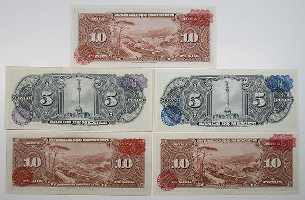 Mexico... Lot includes a pair of 5 Pesos and trio of 10 Pesos banknotes, including a replacement note. ABNC. P-57a; 57b; 58a; 58e; 58*. About to Choice Unc.