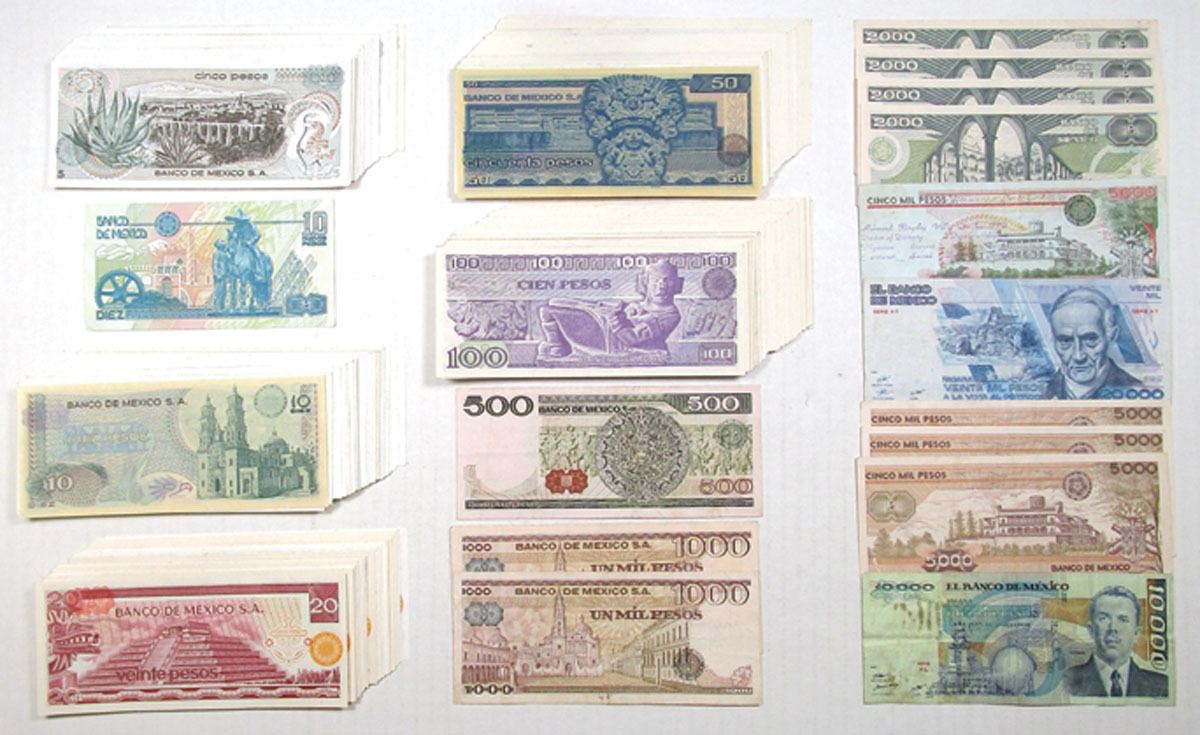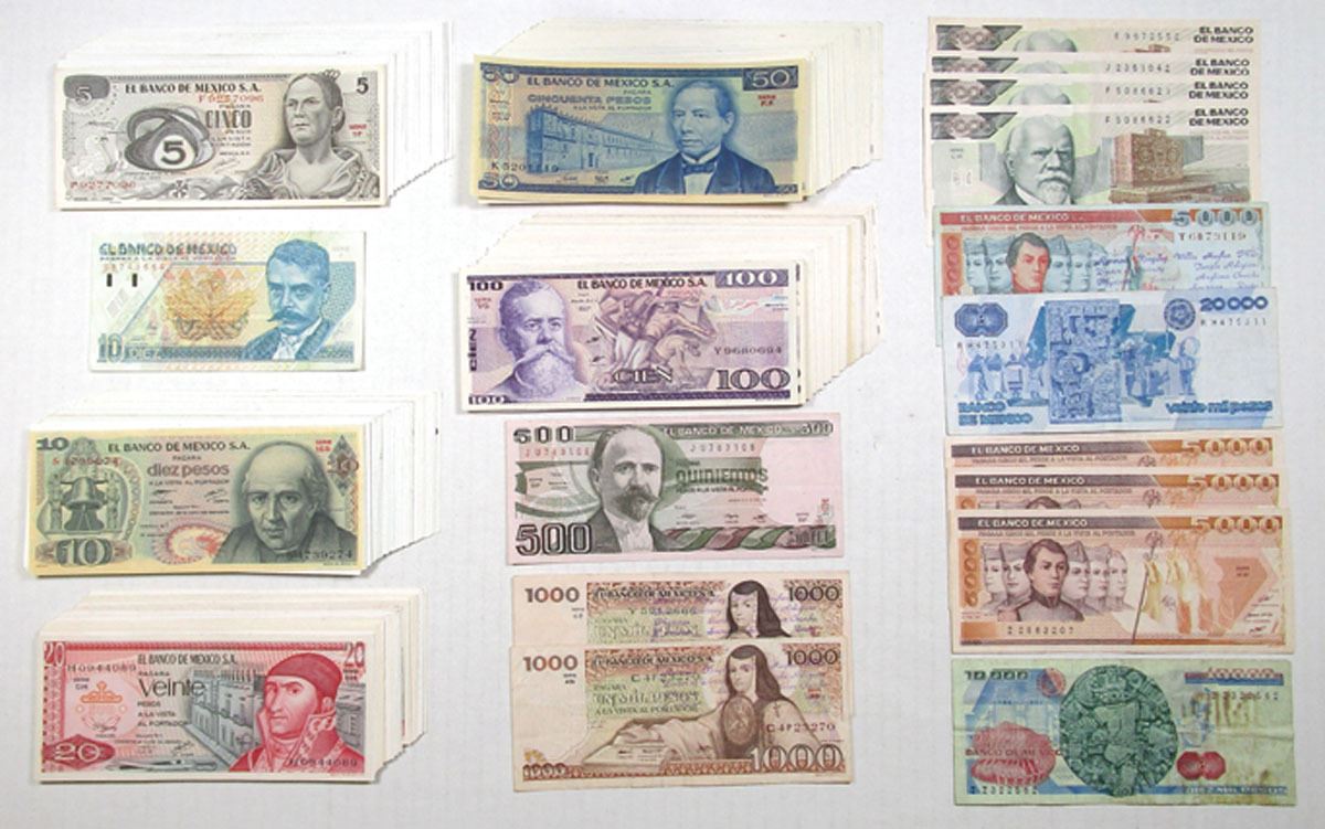 Mexico, 1969-92. Lot of 180+ Issued Banknotes, Includes: 5 Pesos, P-62 (24); 10 Pesos, P-63 (44); 20 Pesos, P-64 (24); 1000 Pesos, P-70b & P-70c; 5000 Pesos, P-71; 50 Pesos, P-73 (34 pcs) and 100 Pesos, P-74 (50 pcs), 500 Pesos, P-75a; 2000 Pesos, P-86a & P-86b (3); 5000 Pesos, P-88b (3) and more. (182). Mainly Uncirculated to Gem Uncirculated condition with a few circulated examples. Sold "AS IS" no returns accepted.
