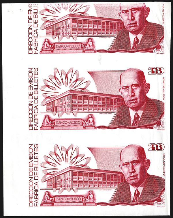 Mexico, 20 denomination, Uncut uniface Proof sheet of 2 and 3/4ths of the top note, printed on white paper in dark red without underprint, Portrait of Don Rodrigo Gomez on right and the bank on the left, "Muestra Sin Valor" engraved in small letters as part of the design on the right. XF to AU due to archival folds and handling on right. Printed by Banco De Mexico.