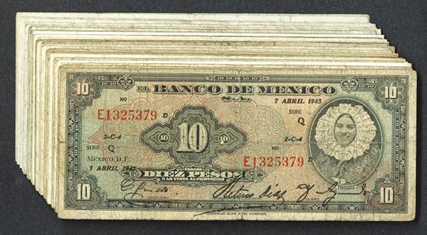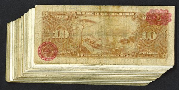 Mexico. 10 Pesos. 1941-67. Female at right. ABNC imprint. Mostly Very Good or better. 36 pieces.