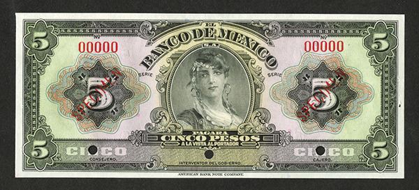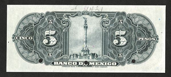 Mexico, 5 Pesos, P-34s, Specimen banknote, POC's, Specimen overprints, uncirculated with pin holes on the left and right margins and graffiti on top back margin. ABNC.