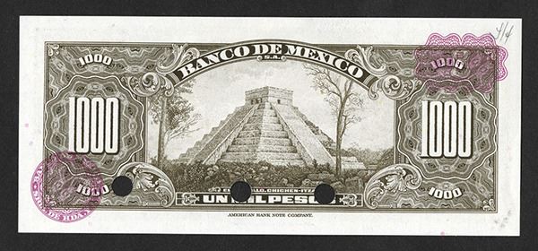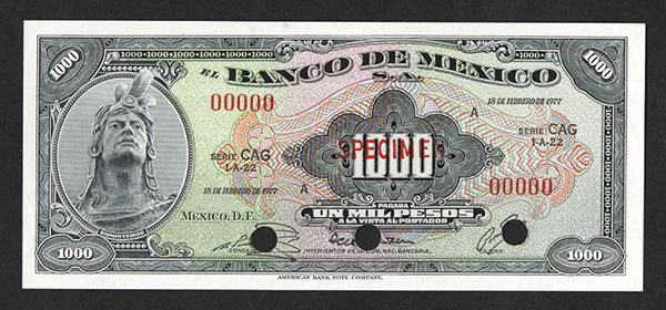 Mexico, 1000 Pesos, P-52ts, Unlisted Specimen, POC's, Specimen overprints, Choice to Gem Uncirculated. Pencil graffiti on the back top margin. ABNC.