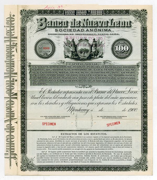 Monterrey, Mexico, 1900. 100 Pesos, Specimen, black borders and undertints. Indians and flags flank Arms of Nueva Leon or Monterrey. Red SPECIMEN overprint and POC's. Coupons attached. VF-XF Condition. ABNC. No more then 4 or 5 exist of this specimen, if it were a banknote, you could add a "0" to the price.