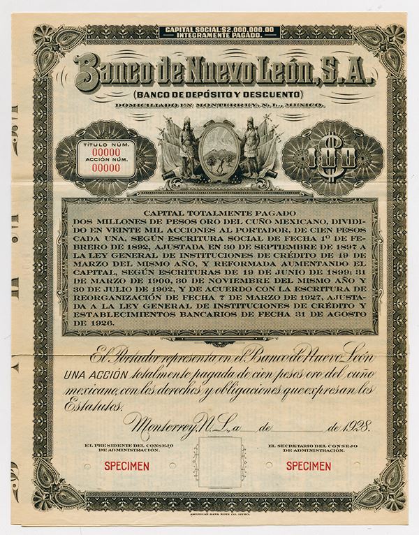 Monterrey, Mexico. 1 Share = 100 Pesos, Specimen Bond, Vertical format, Coupons attached, Nuevo Leon arms on top center, POC's, VF condition with archival reinforcement of light splitting at folds, ABNC. Rare Bank and extremely rare as a specimen.