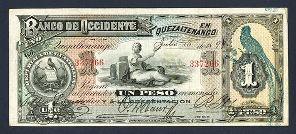 Guatemala. 1 Peso SCWPM S173b 15.7.1899. Printed date, stamped signatures. ABNC imprint. Nice Very Fine.