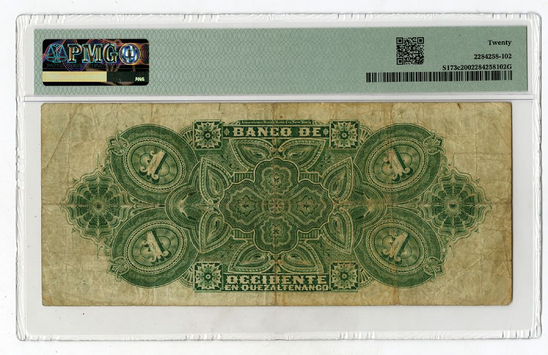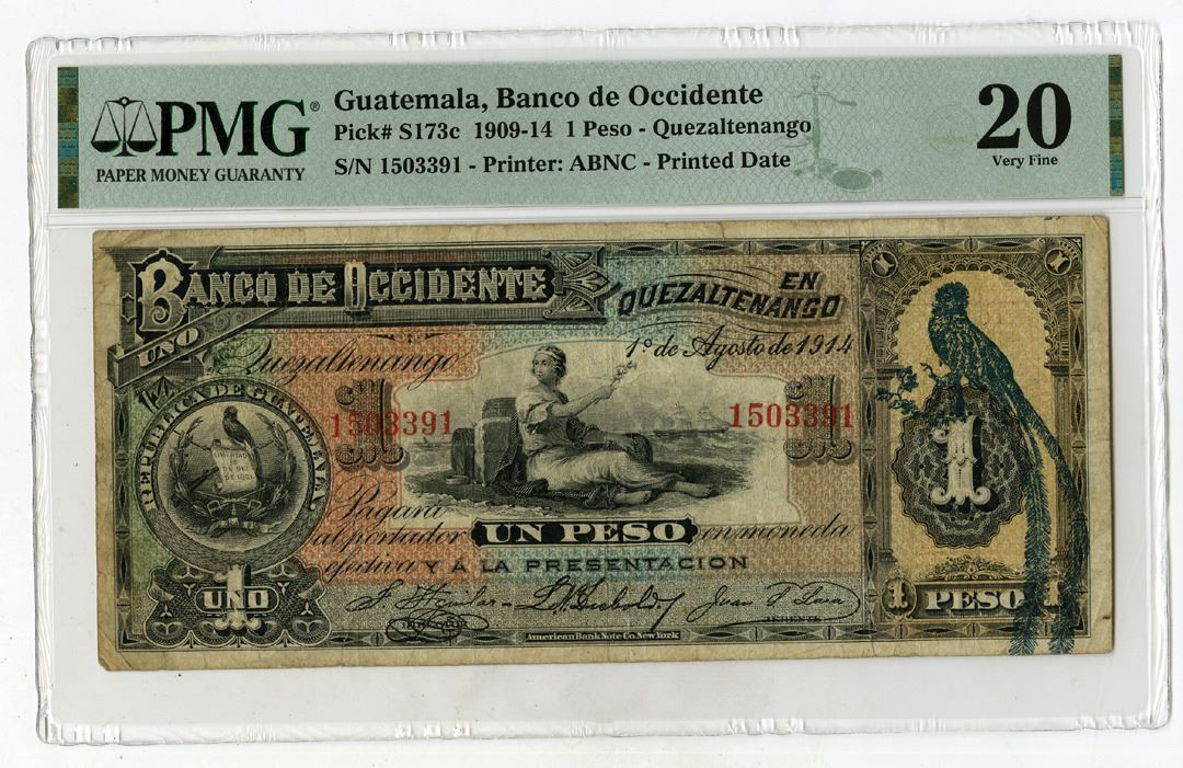 Guatemala, 1909-14. 1 Peso, P-S173c, Issued Banknote, Black on m/c underprint, Arms at left and seated woman with bales and caduceus (Commerce) at center, Back is green, S/N 1503391, PMG graded Very Fine 20, ABNC.