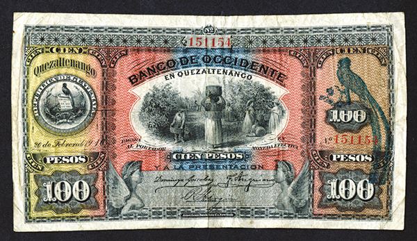 Guatemala. 100 Pesos. P-S182b. 20.2.1910. Bold underprint colors on this large format note. Very Fine.
