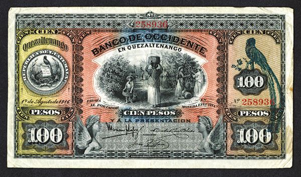 Guatemala. 100 Pesos. P-S182b. 1.8.1916. Bold underprint colors on this large format note, a few stains in right margin. Very Fine.