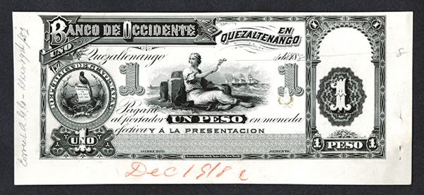 Guatemala. 1 Pesos. P-173p. Uniface face proof in black on card stock. Pencil notations for corrections. Dated December 1882. ABNC. Normal production room handling, light spot near right center. Extremely Fine.