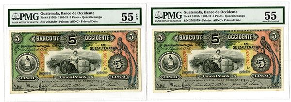 Quezaltenango, Guatemala, Lot of 2 notes, both sequential, both are dated 1st August, 1916, 5 Pesos, P-S176b, Issued banknotes, Black on m/c underprint, Arms on left, seated Woman in middle, quetzal at right, Back is brown but listed in SCWPM as green, S/N's 2763879 and 2763880, one is PMG graded About Uncirculated 55 and the second is About Uncirculated 55 EPQ. Very attractive and colorful notes rarely seen this nice and as sequential pairs, ABNC. (2)