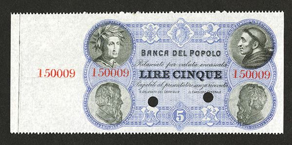 Italy. 5 Lire. Unlisted in SCWPM, bank is types of S941-S945. Black on blue underprint. Perforated top and bottom. Dante and Priest at top corners. POCs with counterfoil. Choice Uncirculated.