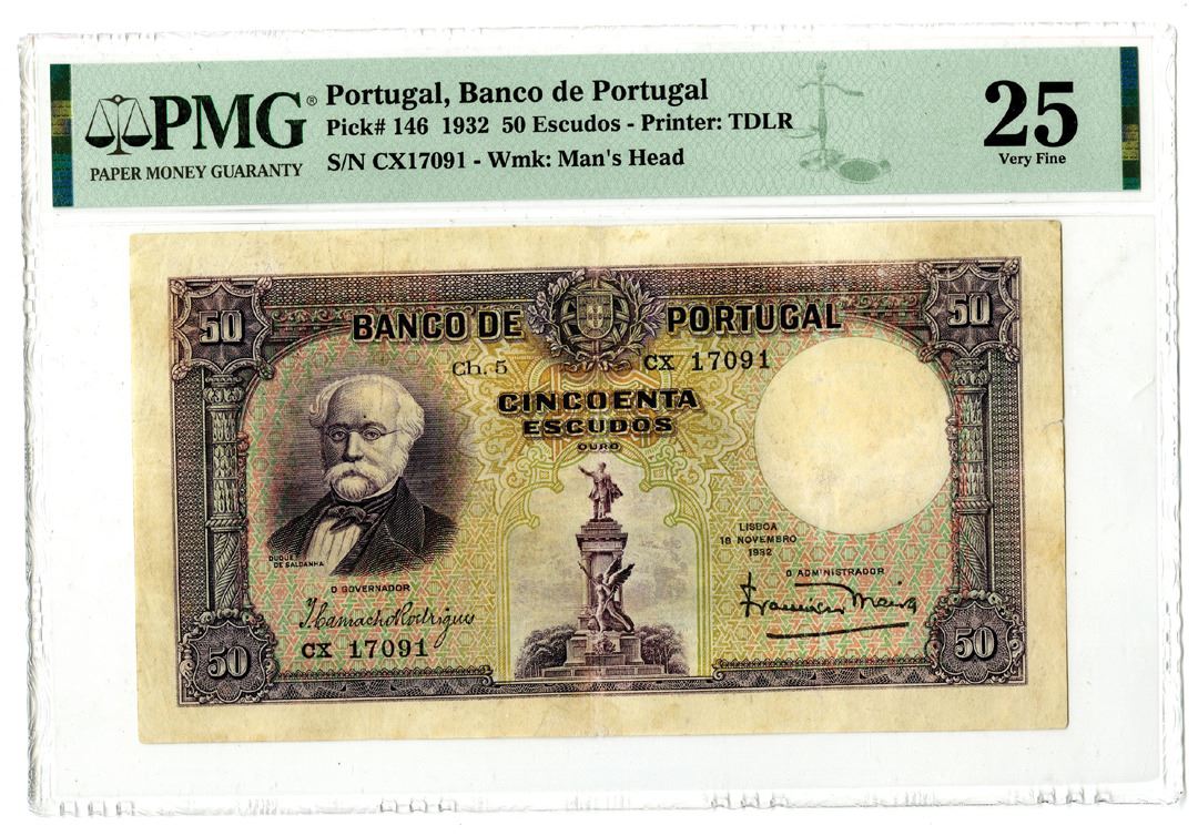 Portugal. 1932, 50 Escudos, P-146, Issued banknote, Brown on m/c, PMG graded Very Fine 25 with note of minor repairs. , TDLR