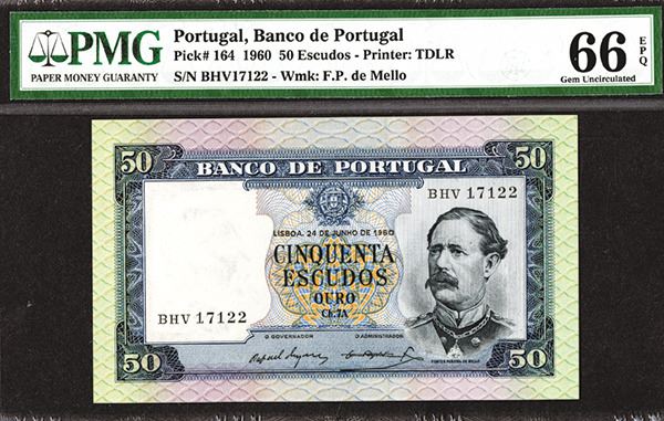 Portugal. 50 Escudos. P-164. Fonts Pereira de Mello at right end. PMG graded Gem Uncirculated 66 EPQ.