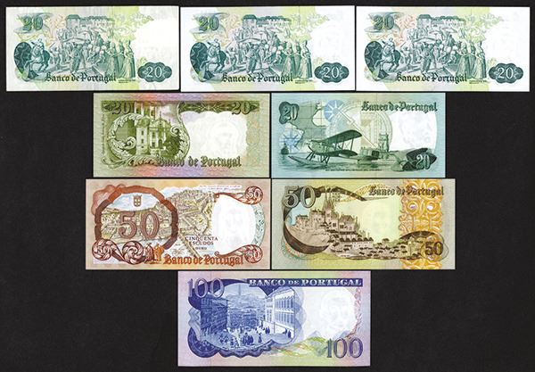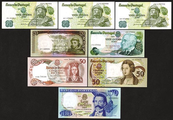 Portugal. 20, 50, 100 Escudos. P-167a, 168 (o vice-governador), 169a, 173 (3, one is VF), 174a, 176a. Choice Uncirculated except where noted. 8 pieces.