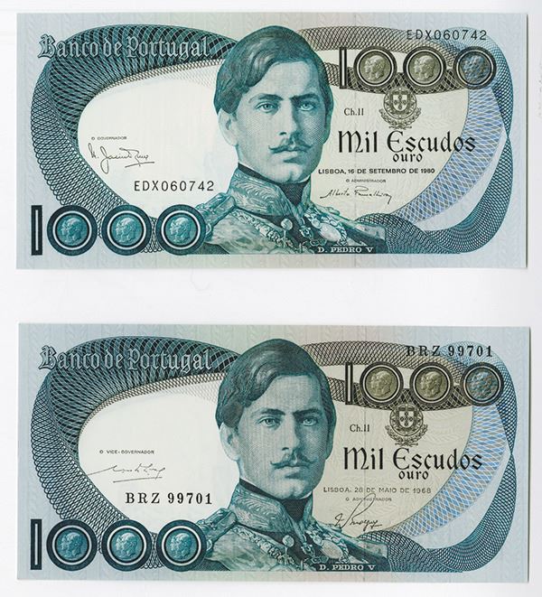 Portugal. Issued 1000 Escudos, 1968, P-175a; and 1980, P-175b. Both Uncirculated.