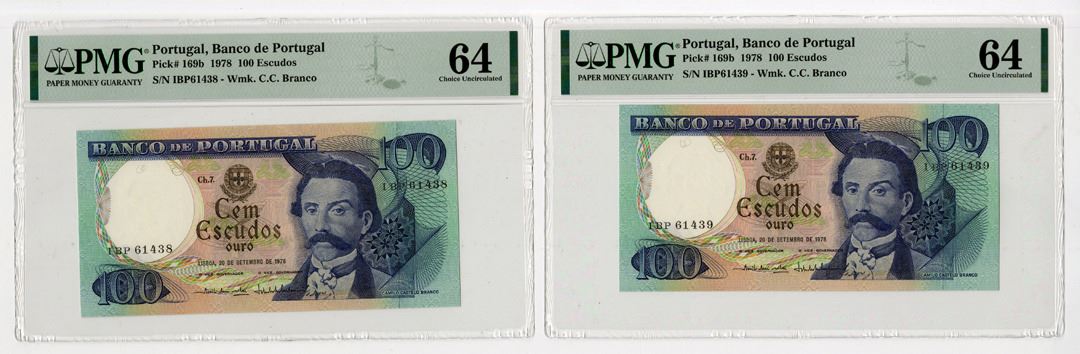 Portugal, 1978. Lot of 2 sequential banknotes, both PMG graded Choice Uncirculated 64, Includes: Sequential pair of 100 Escudos, P-169b issued banknotes. Blue on m/c underprint with portrait of Camilo Castelo Branco at right. S/Ns IBP61438 & IBP61439. Attractive pair of notes. (2).