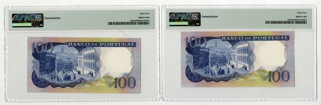 Portugal, 1978. Lot of 2 sequential banknotes, both PMG graded Choice Uncirculated 64, Includes: Sequential pair of 100 Escudos, P-169b issued banknotes. Blue on m/c underprint with portrait of Camilo Castelo Branco at right. S/Ns IBP61438 & IBP61439. Attractive pair of notes. (2).